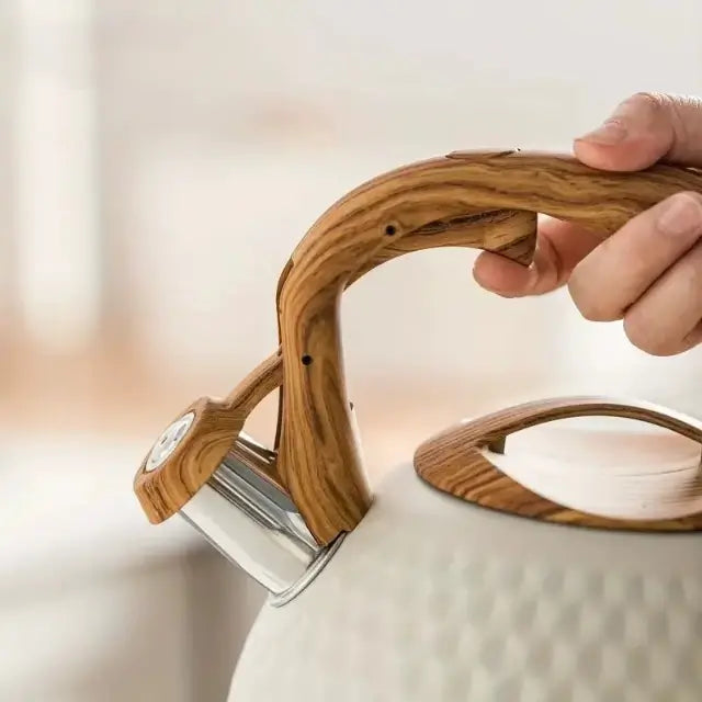 A Chaleira Wave é a companhia perfeita para os amantes de chá e café que valorizam design, funcionalidade e a cerimônia do preparo. Sua textura com ondas em baixo e alto relevo, aliada à elegante cor creme e detalhes em madeira, transformam cada uso em uma experiência única.